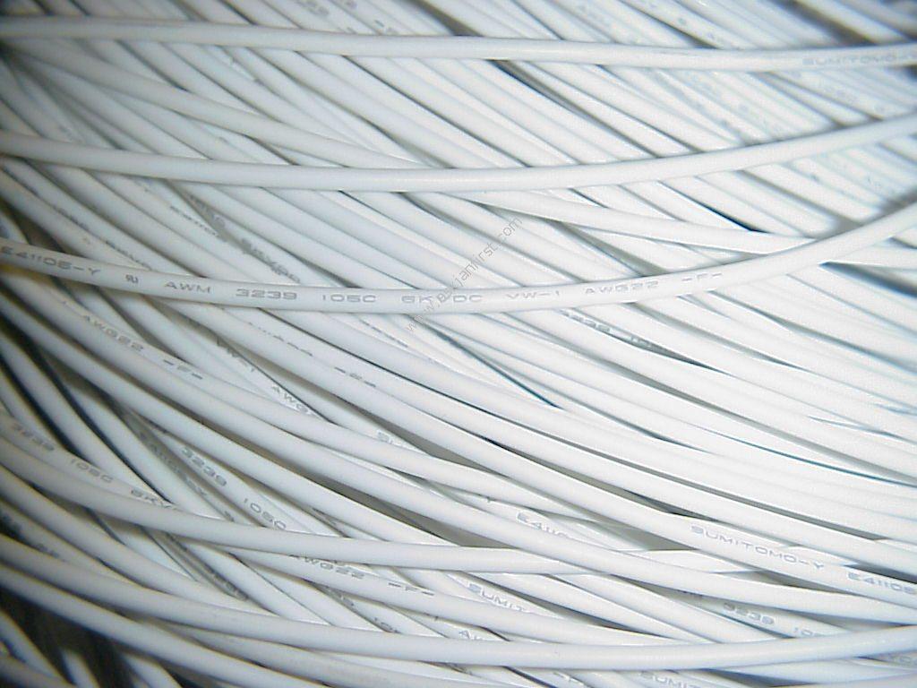 Hochspannungsleitung, spezifiziert für 6 kV, weiß, Meterware von der Rolle. Für Hochspannungsaufbauten aber auch zum Aufbau von hoch zuverlässigen Verdrahtungen in Netzteilen etc. Sehr flexible Ausführung, 0,65 mm Leiterstärke (AWG22) | High voltage cable, highly flexible, rated for 6kV, white, for HV applications, anode connections etc. AWG22. Price per meter | Câble pour haute tension jus´q au 6kV, blanc, très flexible. 0,65 mm diamètre du conducteur Prix pour un mètre |