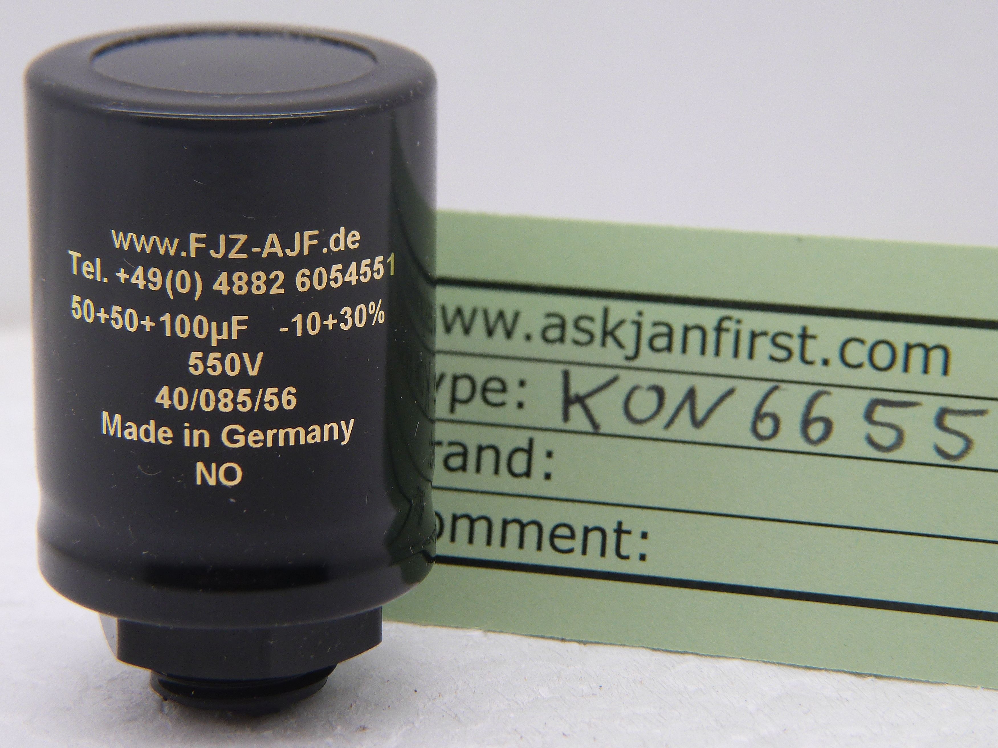 |   |   | KON6655 | Sondertype 50+50+100uF, 550V Minus an Lötfahne. Für z.B. Tonbandgeräte, aber auch natürlich als universeller Dreifachelko. Kompakter Becher, 35*45 | Special type, triple, negative on solder lug, 50+50+100uF, 550V, special for european tape recorders and - of course - also a multi purpose can cap. Can 35*45mm | Chimique spécial, 50+50+100uF 550V, taille 35*45mm, pour les magnétophones et bien sur aussi comme type universel. | 27,90 | 33,20 | FTCap