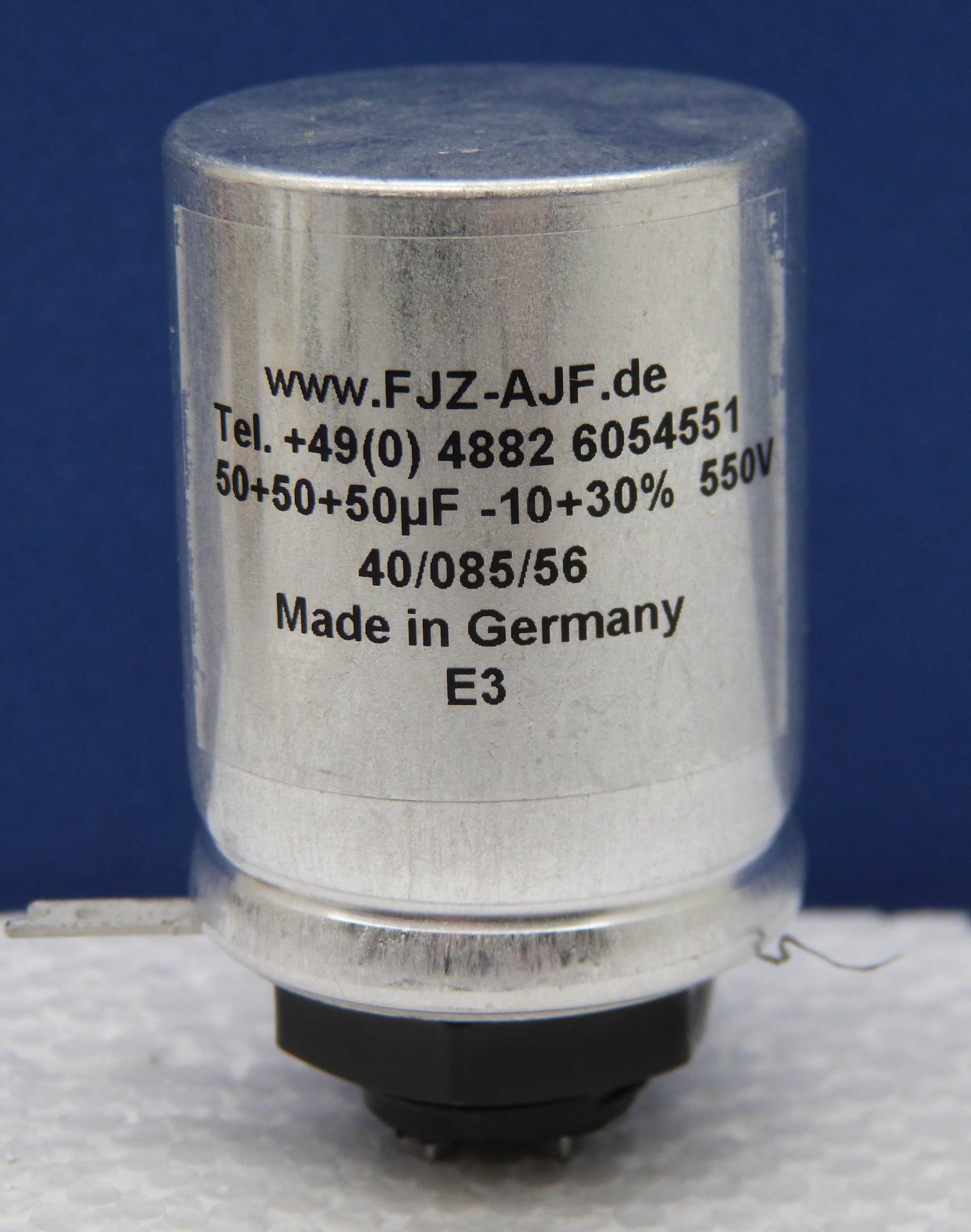Gitarrenamps und überall dort, wo es wirklich eng wird. DIN-Pins mit Lötfahnenlochung, d.h. für Platinen- und Bedrahtungsmontage verwendbar. | Radial electrolytic, current manufacture Triple-50 µF 550V (!) very very compact design, 30mm diameter, use in TVsets, as retrofit to fill cans, on PCBs and also for free wiring, pins allow both options. Use where space is REALLY CONFINED | Triple chimique, 3 * 50 µF 550 V Fabriqué en Allemagne, 30 mm de diamètre, très très très compacte pour utilisation dans les TV, comme retrofit, dans les amplis compacts, tuners etc. Excellent ou l´espace est vraiment très limité. | 22,17 | 26,38 | FTCap