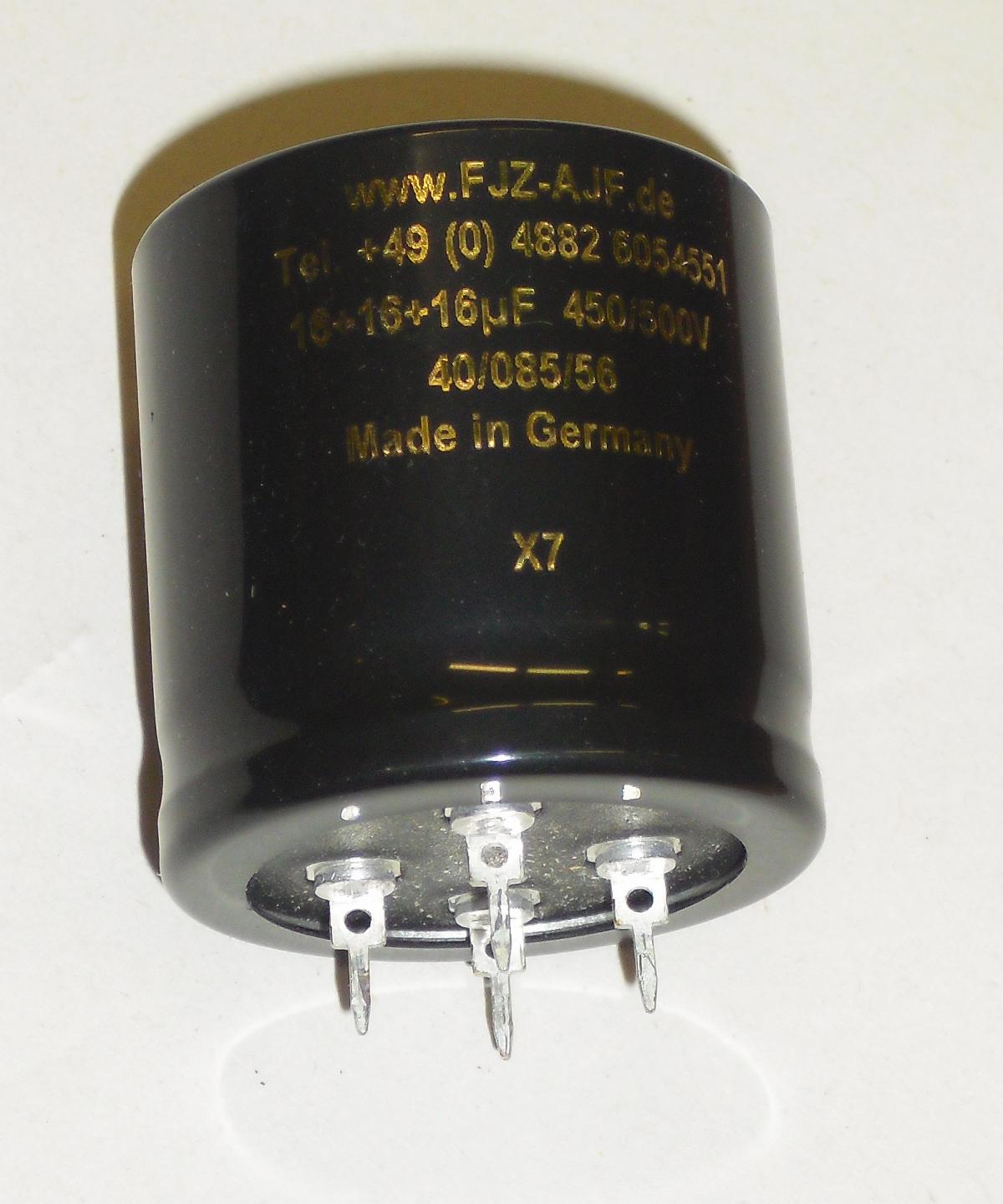 Tuner, Gitarrenamps und überall dort, wo es eng wird. DIN-Pins mit Lötfahnenlochung, d.h. für Platinen- und Bedrahtungsmontage verwendbar. | Radial electrolytic, current manufacture Triple-16 µF ( 16+16+16 uF), very compact design, 35mm diameter, use in PCBs and also for free wiring, pins allow both options. | Triple chimique, 3 * 16 µF 450 V Fabriqué en Allemagne, 35 mm de diamètre, très compacte pour utilisation das des amplis compacts, tuners etc. | 11,00 | 13,09 | FTCap