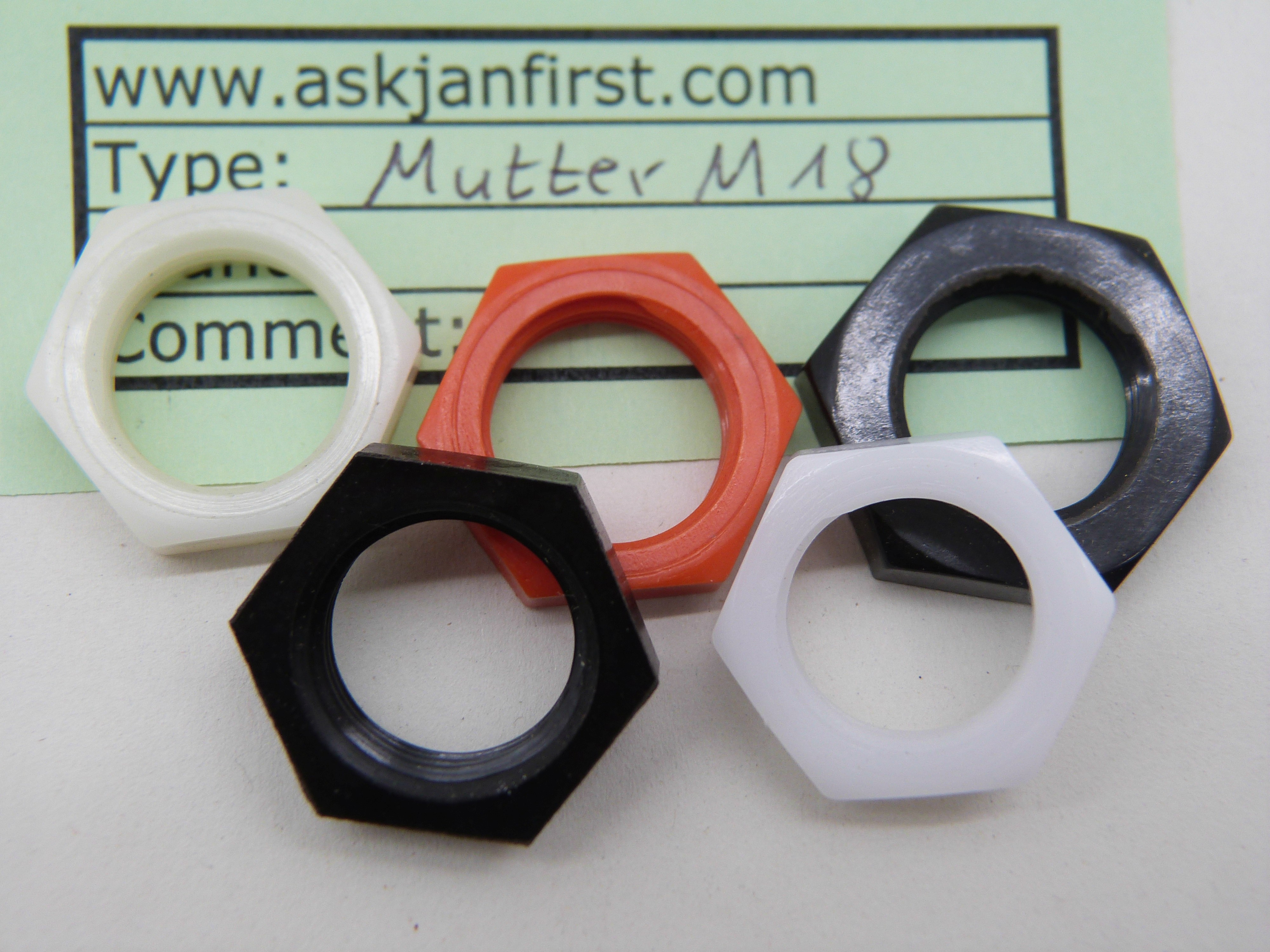 |   | Mutter | Ersatzmutter M18, Farbe nach Verfügbarkeit (natur, schwarz, orange) | Replacement nut, M18, 18mm for european screw mount caps. | Ècrou M18, 18mm pour chimiques, pièce de rechange | 0,70 | 0,83 | FTCap