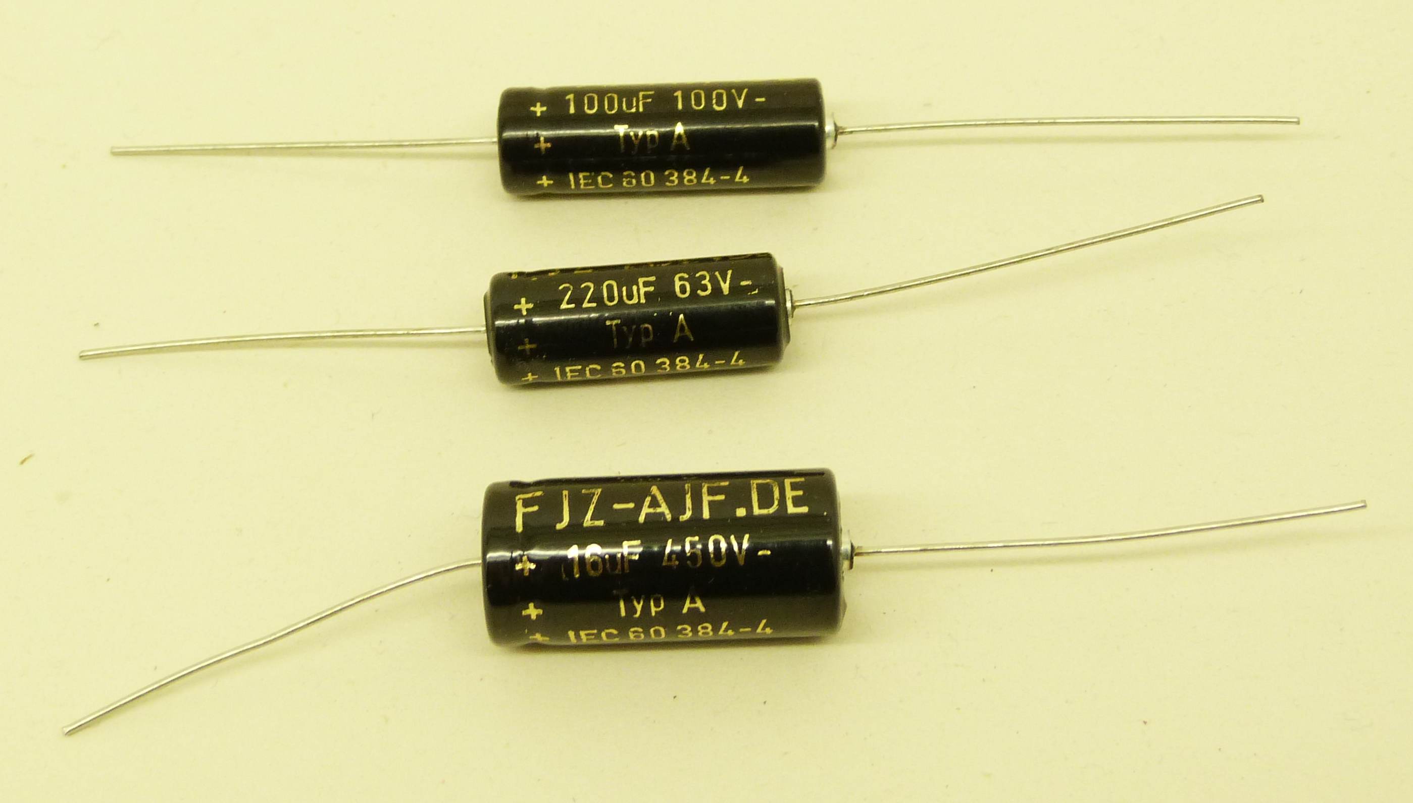 |  | Axiale Gitarrenverstärker-Spezialtypen, eignen sich natürlich auch für andere Anwendungen. Radial kontaktierte Becherelkos finden Sie weiter unten in der Liste. | Axial leads Electrolytics for use in guitar amps. Those types have been specially designed to replace dead caps in tube guitar amps. | Condensateurs à vis axiaux constuit pour les amplis de la guitare | |||||