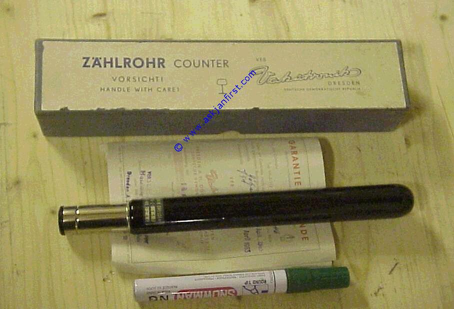 |   |   | 4 | VA - Z 241 | D | s | Mantelzählrohr, Glas, Länge ca 200 mm ; Durchmesser 30mm, schwarz lackiert | 200 mm lenth counter tube | compteur geiger | 40,00 | 46,40 | Antiquität, Infos hier |