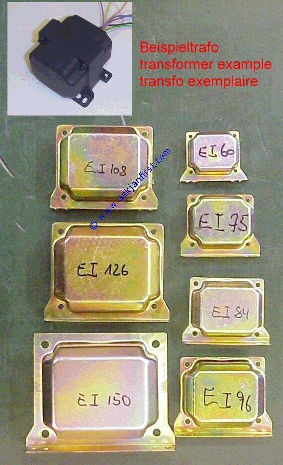 40-50% Reserve rechnen. Alle Stromangaben beziehen sich auf die Wechsel- spannungsseite, also vor dem Gleichrichter. Bei Gleichrichtung und Siebung gilt: Wenn die Leistung über eine Gleichrichterbrücke mit anschließendem Elko gezogen wird, beträgt die effektive Trafobelastung aufgrund der hohen Nachladestromspitzen, die quadratisch in die effektive Belastung eingehen ca. das 1,5-fache der ohmschen Nennleistung. Ferner: Durch die Siebung steigt die Spannung, im Idealfall auf den Scheitelwert, also das 1,4 fache der Wechsel-Effektivspannung. Da Leistung als Produkt von Strom und Spannung aber nicht aus dem Nichts kommen kann, muß die Strombelastbarkeit auf den 1/1,4-fachen ca 70% Wert heruntergehen. Das müssen Sie bei der Auslegung unbedingt zugeben. | GENERAL ADVISE FOR THE DIMENSIONING OF A MAINS TRANSFORMER: ALL current ratings given are AC, such as the current comes out of the transformer. This means if you put an ohmic load ( a lightbulb) on the secondary, the transformer delivers the rated current. When recitfying: ALWAYS overrate (!) transformers by approx 50%. (If you need, say, 100mA DC calculate 200mA AC) This has two reasons: Power surges due to capacitor charging produce approx 40-50 % additional dissipation in the transformer. And: Power is the product of voltage and current so when the voltage rises after filtering the current rating drops, no energy is for free... | AVIS GENERAL POUR  DIMENSIONER UN TRANSFO D´ALIMENTATION Tous courants sont indiqué en courant alternativ, valide pour une charge ohmique ( une ampoule par exemple) En redressant TOUJOURS dimensionez votre transfo avec un minimum de 50% de reserve. ( Si besoin, de, par exemple, 100mA DC, calculez le transfo avec 200mA AC ) Deux raisons: Les courtes mais hautes courants surges qui chargent les condensateurs de filtrage causent de la chaleur additionelle dans les bobinages. Et en redressant et filtrant la tension s´augmente. Puissance est le produit de tension et courant, si le tension s´augmente le courant se basse pour la même piuissance, puissance n´ est jamais gratuit. | ||||||